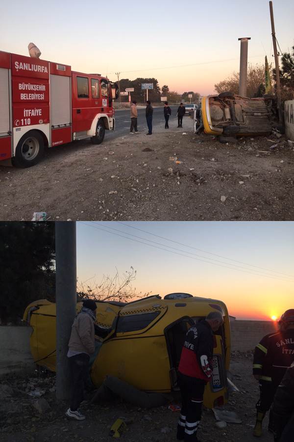 Kaza Sabah erken saatlerinde Şanlıurfa-Akçakale yolunda meydana geldi. Alınan bilgilere göre Eski havaalanı yolunda sürücüsünün ismi henüz belli olmayan 63 T 0081 plakalı ticari taksi sürücüsünün direksiyon hakimiyetini kaybetmesi sonucu araç takla atarak yol savruldu. Kazada 2 kişi yaralandı. Sürücülerin haber vermesi ile olay yerine sağlık ekibi, itfaiye ve polis intikal etti. Araçta sıkışan 2 yaralı itfaiyenin çabalarıyla sıkıştıkları yerden çıkartıldı. Yaralılara olay yerinde yapılan ilk müdahalenin ardından Ambulansla Mehmet Akif İnan Eğitim ve araştırma hastanesine kaldırıldı. Kazayla ilgili soruşturma başlatıldı.