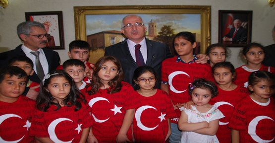 Şanlıurfalı minik öğrenciler Al Bayraklı ve bir çok dilde 'korkma' yazılı tişörtler ile Vali Tuna'yı ziyaret eden minik çocuklara çeşitli hediyeler verildi. Ziyaret sırasında Haliliye kaymakamı Yusuf Ziya Çelikkaya'da hazır bulundu.