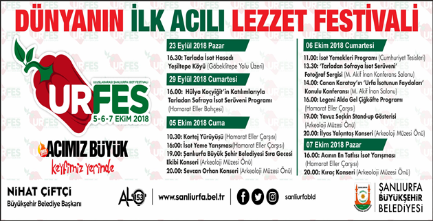 Şanlıurfa Büyükşehir Belediyesi tarafından uluslararası hale getirilen Uluslararası İsot Festivali (URFES) geçtiğimiz gün gerçekleştirilen isot hasadı ile başladı. 23 Eylül - 7 Ekim tarihleri arasında bir dizi programların gerçekleşmesiyle çeşitli etkinliklere konserlere ve yarışmalara ev sahipliği yapacak.