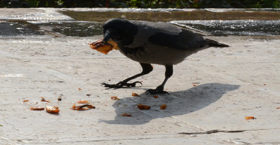 Yemek yiyen vatandaşların başında nöbet tutan kargalar ziyaretçilerden memnun kalıyor.