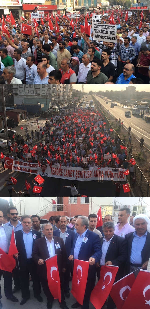 İlçe Milli Eğitim Müdürlüğü hizmet binası önünde bir araya gelen binlerce kişi, kaymakamlık binası önüne kadar yürüdü. Yürüyüşe Şanlıurfa AK Milletvekilleri Mehmet Akyürek ile Ahmet Eşref Fakıbaba,  Viranşehir Kaymakamı Ahmet Yıldız, Ceylanpınar Kaymakamı Ahmet Karatepe, , Viranşehir Başsavcısı Taner Güngör, AK Parti İl Başkan Vekili Cuma Ağaç ve Viranşehirli binlerce kişi katıldı. Ellerinde Türk bayrakları ile yürüyen kalabalık, sık sık ‘Kahrolsun PKK’, 'Kahrolsun FETÖ' ve 'Kahrolsun IŞİD' sloganları attı.